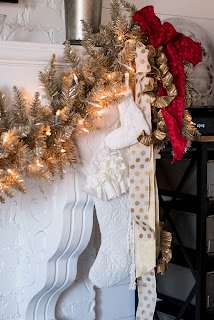 She knows how to tie the best bows. She can cluster ribbon like you've never seen. We really love the red, gold and cream combo she had going on with her mantle.